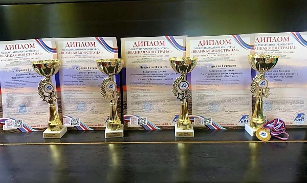 Юные вокалисты заслуженного коллектива народного творчества России детской эстрадной студии «Час ханат» Национального центра народного творчества имени С.П. Кадышева награждены дипломом «Гран-при» и пятью дипломами «Лауреат» Международного конкурса «Великая моя страна». Конкурс прошёл в рамках творческого проекта «Культура. Искусство. Творчество».